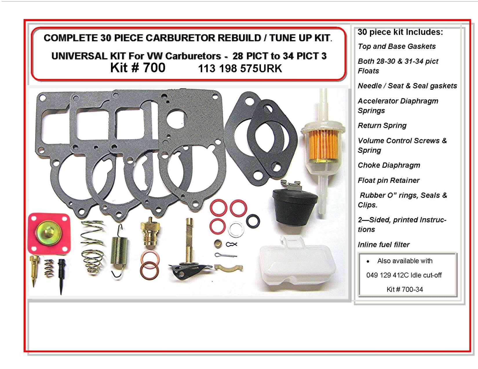 A complete overhaul kit. Capable of servicing any Solex VW Carburetor from a 28 thru 34 pict 3 (does not have the diaphragm for a 34-4. Includes floats, springs and inline fuel filter 30 piece Rebuild kit Includes Floats, Springs & Fuel Filter Printed Instructions. Efuel safe/ Extended life Alcohol resistant Diaphragm.