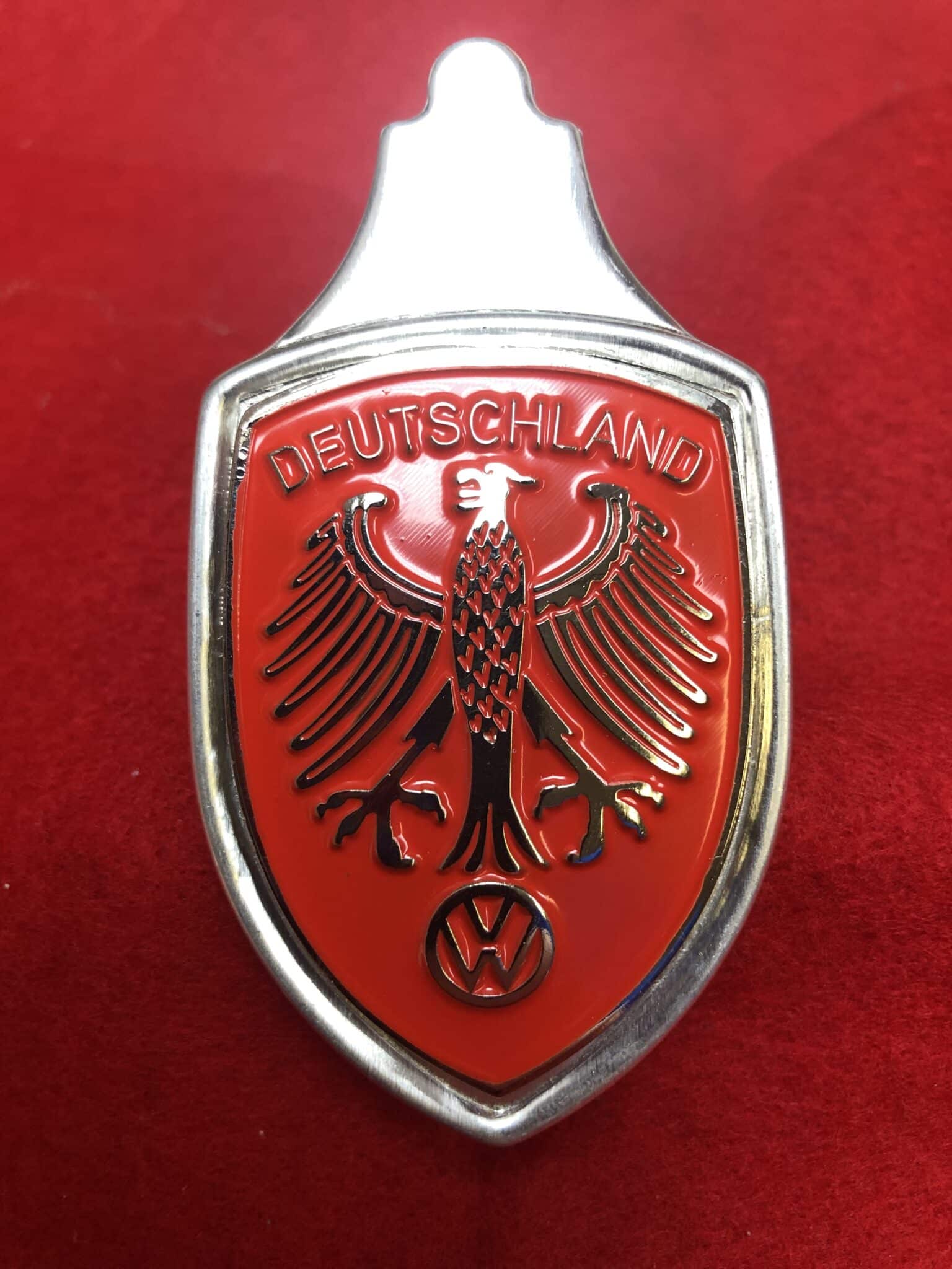 Volkswagen VW German Deutschland Hood Badge Crest. Made from a cast alloy metal and then painted to bring out the details. Can be mounted on hood, grille or just about anywhere you like. Unit included mounting tabs for tight fit.