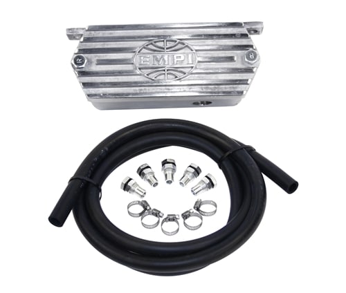 VW oil breather kit is made from cast aluminum and helps reduce crankcase pressure, eliminate blow-by and oil loss. High revving modified engines require more crankcase ventilation than the stock breather can supply. With the aluminum oil breather kit the blow-by oil is collected in the foam filter and the air vapors are vented to the atmosphere. The kit includes heavy duty breather hose, plus internal baffles that include a screen mesh shelf to elevate the foam filter element. The breather box kit includes 8 feet of 1/2″ oil hose, 5 vent fittings and 5 hose clamps.